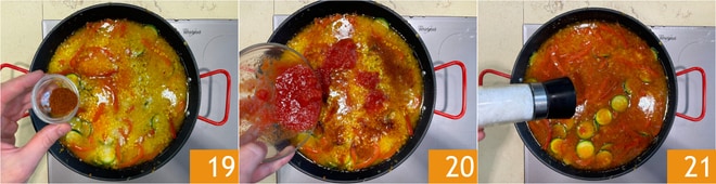 Ajoutez également le paprika 19 et la purée de tomates 20. Ajustez le sel et le poivre 21