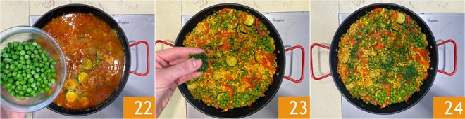 Ajoutez les petits pois 22, mélangez une dernière fois et faites cuire pendant 15-20 minutes à feu moyen-doux. Pendant la cuisson, il est important de ne pas remuer la paella pour éviter de la brûler ; de cette manière, une délicieuse croûte dorée se formera au contact de la poêle. Si nécessaire, vous pouvez ajouter plus de bouillon de légumes. Lorsque le riz est cuit et a absorbé tout le liquide, retirez la poêle du feu et laissez reposer quelques minutes. Terminez avec un filet d'huile d'olive crue et du persil frais haché 23. La paella végétarienne est prête à être dégustée 24.