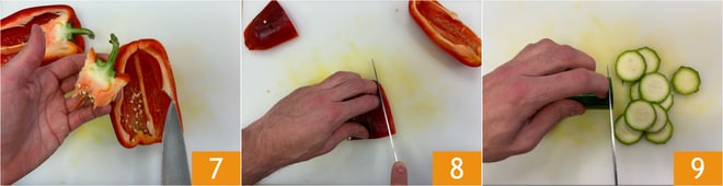 Coupez le poivron en deux et retirez le pédoncule 7, les graines et les filaments internes, puis coupez-le en lanières 8. Équeutez la courgette et coupez-la en rondelles 9.