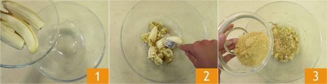 Pour réaliser le banana bread à la noix de coco, commencez par mettre les bananes mûres dans un grand bol 1 et écrasez-les avec une fourchette 2, puis ajoutez le sucre de canne 3.