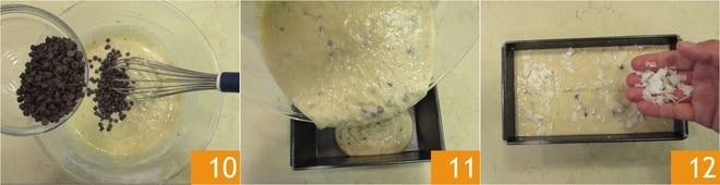 Enfin, incorporez les pépites de chocolat 10. Versez la pâte dans un moule à cake de 20x11 cm que vous aurez préalablement graissé avec de l'huile de coco et fariné 11, puis garnissez la surface avec des copeaux de noix de coco 12.