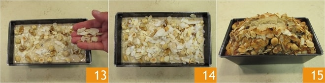 Ajoutez également les fruits secs 13 et faites cuire dans un four statique préchauffé à 180°C pendant environ 50-55 minutes 14. Une fois cuit, sortez le banana bread à la noix de coco du four et laissez-le refroidir avant de le démouler et de le servir 15 !