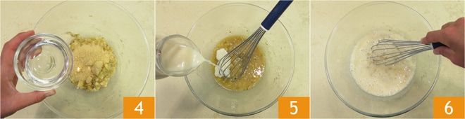 Ajoutez également l'huile de coco 4 et mélangez les ingrédients avec un fouet. Ajoutez le lait de coco 5 et mélangez à nouveau pour bien amalgamer le tout 6.
