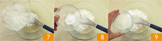À ce stade, ajoutez la farine 7, la levure 8 et la noix de coco râpée 9. Incorporez les poudres avec le fouet jusqu'à obtenir un mélange homogène.