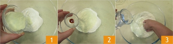 Pour préparer le pain au levain, commencez par la pâte. Versez dans un bol la farine 00 et la semoule 1, ajoutez le malt 2 et versez l'eau à température ambiante en filet en commençant à pétrir avec les mains 3.