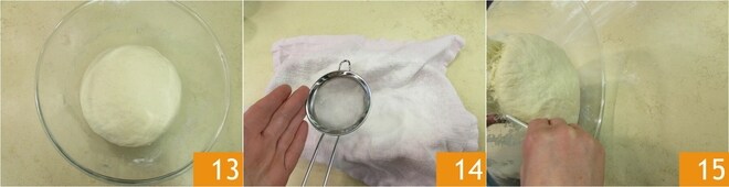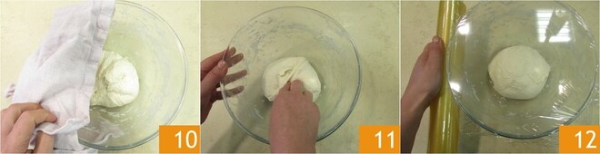 Couvrez avec un torchon 10 et laissez reposer pendant 15-20 minutes. Répétez ces opérations 3 fois supplémentaires 11, de manière à faire 4 tours de pliage. Vous remarquerez que la pâte deviendra très lisse. Couvrez avec du film plastique 12 et laissez lever pendant 3 heures à température ambiante.