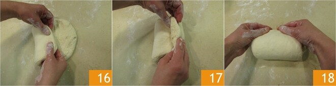 Aplatissez-la légèrement pour former un disque 16. Faites ensuite un pliage en trois, en ramenant d'abord un côté de la pâte vers le centre 16, puis faites la même chose avec l'autre côté 17. Pressez doucement pour faire adhérer la pâte et tournez-la pour que le pli soit en dessous 18.
