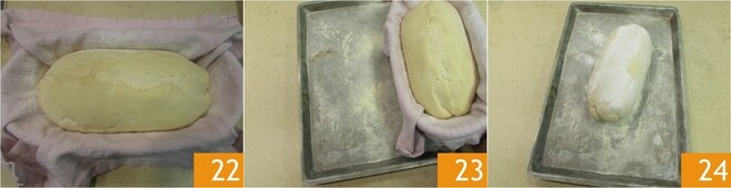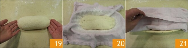Allongez-la délicatement pour obtenir un bâtonnet 19. Transférez ensuite dans le panier à pain, cette fois en plaçant l'ouverture vers le haut 20. Couvrez avec le torchon 21 et laissez lever encore 2-3 heures.