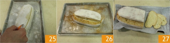 et, avec une lame bien aiguisée, réalisez une incision longitudinale sur toute la longueur du pain 25. À ce stade, enfournez le pain dans le four préchauffé à 225° en mode statique, ajoutez au fond du four 10 glaçons qui, en fondant, libéreront l'humidité nécessaire, et faites cuire pendant 20 minutes. Passez ensuite au mode ventilé et faites cuire le pain pendant 10 minutes de plus. Sortez ensuite le pain au levain 26, transférez-le sur une grille et laissez-le refroidir avant de le servir 27.