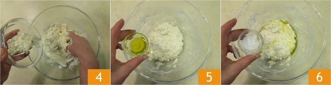 Lorsque l'eau a été absorbée, ajoutez le levain, rafraîchi la veille et en tout cas depuis au moins 5 heures 4. Continuez à pétrir. Ajoutez l'huile 5 et le sel 6.