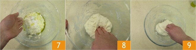 Pétrissez encore avec les mains 7 jusqu'à obtenir une pâte homogène. Couvrez avec un torchon et laissez reposer pendant 15-20 minutes. Réalisez maintenant le premier tour de pliage. Prenez un bord de la pâte, soulevez-le doucement et ramenez-le vers le centre 8. Tournez le bol 9 et répétez cette opération. Continuez ainsi jusqu'à avoir pris tous les bords extérieurs de la pâte, en ayant tourné complètement le bol.