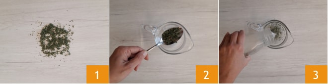 Pour préparer le pain au thym avec levain, commencez par préparer l'infusion de thym, que vous pouvez faire même la veille. Nettoyez le thym en passant les doigts sur les branches pour n'en extraire que les feuilles 1. Portez à ébullition 350 g d'eau ; prenez une carafe et mettez deux cuillères à soupe de thym frais 2, puis ajoutez l'eau bouillante 3.