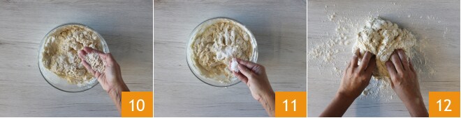 Ajoutez le malt en poudre 10 et le sel fin 11. Renversez la pâte sur un plan fariné et pétrissez avec les mains 12