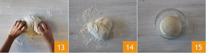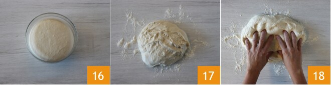 et laissez-la lever jusqu'à ce qu'elle ait doublé de volume 16. Cela prendra environ 5 heures. Une fois le temps de repos écoulé, renversez la pâte sur le plan fariné 17 et dégonflez-la délicatement avec les mains, en essayant de lui donner une forme rectangulaire 18.