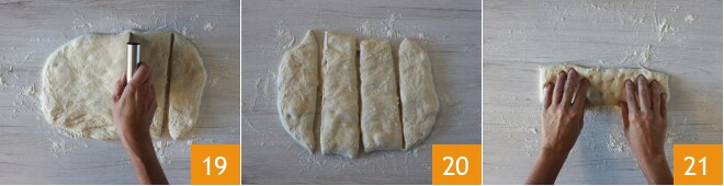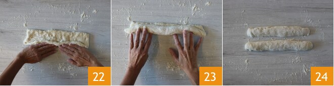 et formez les baguettes : commencez par fermer le rectangle de pâte du côté long vers l'extérieur 22 et enroulez-le jusqu'à fermeture complète 23 24.