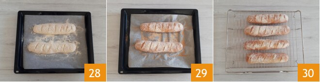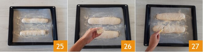 Placez les baguettes sur une plaque recouverte de papier sulfurisé, avec la fermeture en dessous 25. Laissez les baguettes lever jusqu'à ce qu'elles aient doublé de volume. Cela prendra environ 2 heures. Saupoudrez les baguettes de semoule de blé dur 26 et pratiquez des entailles sur la surface 27,