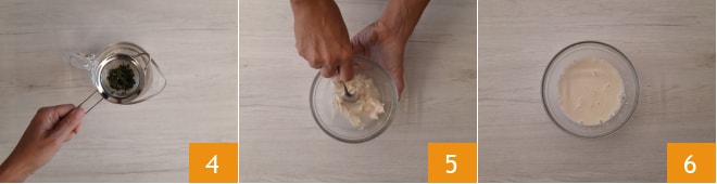 Laissez complètement refroidir l'infusion de thym, puis filtrez-la avec une passoire 4. Émiettez le levain rafraîchi dans un bol, ajoutez 50 g d'eau et mélangez 5 jusqu'à ce qu'il soit complètement dissous 6.