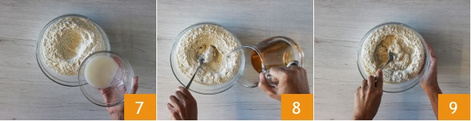 Versez la farine dans un bol et ajoutez le levain dissous 7. Ajoutez l'infusion de thym 8, petit à petit, et mélangez avec une cuillère 9.