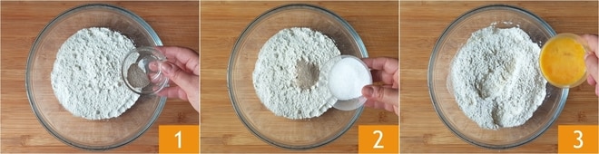 Pour préparer le pain brioché à la Nutella, commencez par verser dans un bol la farine, la levure 1 et le sucre 2. Mélangez avec une fourchette, puis ajoutez l'œuf légèrement battu 3 et mélangez à nouveau.