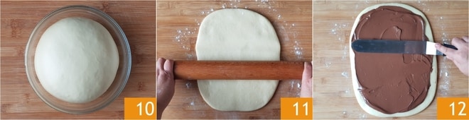 Lorsque la pâte a doublé de volume 10, étalez-la sur le plan de travail légèrement fariné jusqu'à former un rectangle de 24x40 cm 11. Étalez la Nutella sur toute la surface à l'aide d'une spatule, en veillant à laisser environ 1 cm libre du bord 12.