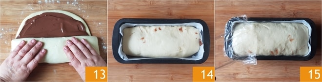 Roulez la pâte du côté le plus court du rectangle 13 et placez le rouleau obtenu dans un moule à cake de 25x11 cm que vous aurez préalablement tapissé de papier sulfurisé, avec la fermeture vers le bas 14. Couvrez le moule avec un film plastique et laissez lever dans le four éteint avec la lumière allumée pendant au moins une heure, ou jusqu'à ce que la pâte atteigne le bord du moule 15.