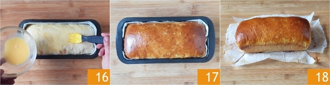 Après ce temps, badigeonnez la surface avec le mélange de jaune d'œuf et de lait 16, puis faites cuire dans un four statique préchauffé à 180° pendant environ 20-25 minutes, en plaçant le moule sur la grille du milieu. Une fois cuit, sortez et laissez refroidir complètement votre pain brioché à la Nutella dans le moule 17 avant de le démouler 18 et de le couper en tranches !