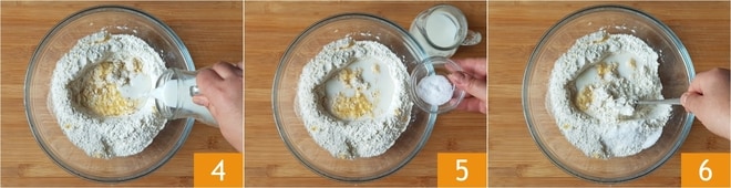 Ajoutez la moitié du lait 4 et le sel 5 et mélangez encore avec la fourchette 6.