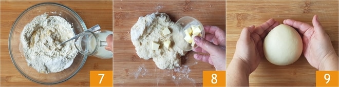 Incorporez enfin le reste du lait 7 et continuez à pétrir la pâte sur le plan de travail. Ajoutez un morceau de beurre à la fois 8, en veillant à ajouter le suivant seulement lorsque le précédent est complètement absorbé. Pétrissez jusqu'à obtenir une pâte lisse et ferme. Formez une boule 9 et remettez-la dans le bol, couvrez avec un film plastique et laissez lever dans le four éteint avec la lumière allumée pendant au moins une heure, ou jusqu'à ce que le volume double.