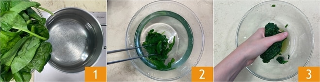 Pour réaliser le pain brioché salé monstrueux, commencez par blanchir les épinards quelques instants dans de l'eau bouillante salée 1, puis égouttez-les dans un bol d'eau froide 2. Égouttez les épinards et pressez-les bien 3.