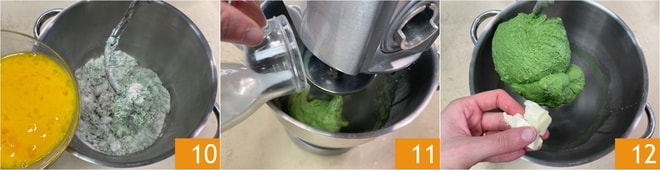 Actionnez le robot pour mélanger les ingrédients, puis versez les œufs battus 10 et continuez de travailler. Lorsque le mélange commence à se former, ajoutez lentement les 30 g de lait restants, en gardant le robot en marche 11. Une fois absorbé, ajoutez le beurre de la même manière, un morceau à la fois 12. Maintenez une vitesse moyenne pour éviter que la pâte ne chauffe trop.