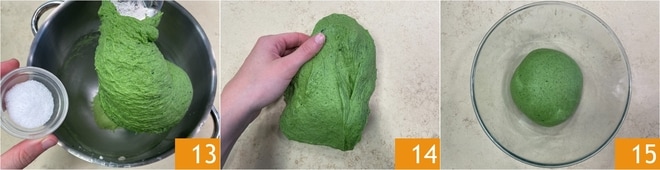 Lorsque la pâte est lisse et bien formée, ajoutez le sel 13 et continuez de travailler pour l'incorporer. Transférez la pâte sur le plan de travail et formez une boule 14, puis placez-la dans un grand bol 15, couvrez avec du film plastique et laissez lever pendant environ une heure, ou jusqu'à ce que le volume double.