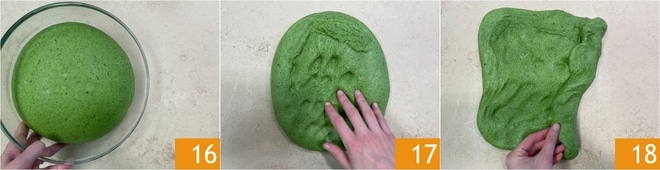 Après le temps de levée 16, étalez la pâte avec le bout des doigts pour former un rectangle 17, puis enroulez-la sur le côté le plus long 18.