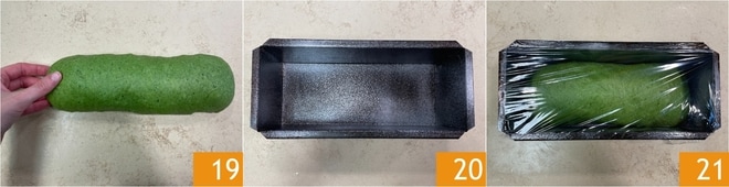 Vous devez obtenir un rouleau aussi serré que possible 19. Transférez le rouleau dans un moule à cake de 25x10x10 cm, préalablement graissé avec de l'huile en spray 20. Couvrez avec du film plastique et laissez lever pendant au moins 30 minutes ou jusqu'à ce que la pâte dépasse le bord du moule 21.