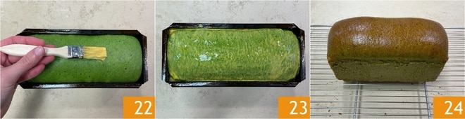 Après ce temps, badigeonnez la surface avec un mélange de jaune d'œuf et de crème que vous aurez préalablement battu ensemble 22, puis faites cuire dans un four statique préchauffé à 170° pendant environ 35 minutes 23. Une fois cuit, démoulez le pain brioché encore chaud et laissez-le refroidir sur une grille 24.