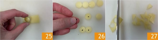 Entre-temps, préparez les décorations : découpez des disques de fromage avec un petit emporte-pièce circulaire 25 et placez un grain de sésame noir au centre pour les yeux 26, puis découpez des petits triangles pour les dents 27.