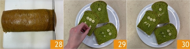 Une fois refroidi, coupez le pain brioché en tranches d'environ 3 cm d'épaisseur 28 et décorez chacune à votre guise avec les petites dents et les yeux en fromage 29. Votre pain brioché monstrueux est prêt à être servi 30 !