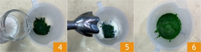 Transférez 100 g d'épinards cuits et pressés dans un récipient, ajoutez 100 g de lait 4 et mixez avec un mixeur plongeant 5 pour obtenir une crème lisse et homogène 6.