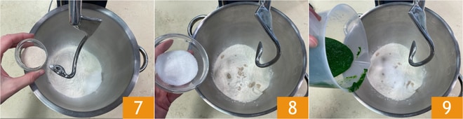 Versez la farine dans le bol du robot pâtissier équipé du crochet, puis ajoutez la levure sèche 7, le sucre 8 et la crème d'épinards 9.
