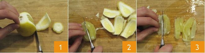 Pour préparer le pain de citron, commencez par éplucher à vif les citrons : retirez la peau avec un petit couteau à lame lisse, en prenant soin d'enlever également la partie blanche, plus amère 1, puis divisez la pulpe entière en deux 2 et avec le couteau, séparez sur la planche les quartiers de pulpe des membranes blanches 3 : il vous faudra en tout 170 g de pulpe de citron.