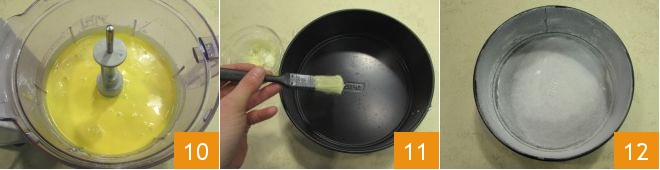 puis mixez le tout jusqu'à obtenir une consistance crémeuse et homogène 10. Prenez maintenant un moule à charnière de 20 cm de diamètre et beurrez-le soigneusement 11, puis farinez-le 12.