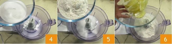 Préchauffez le four en mode statique à 180° et ajoutez tous les ingrédients dans un mixeur équipé de lames : ajoutez la levure chimique, le sucre 4, la farine 5, la pulpe des citrons 6.