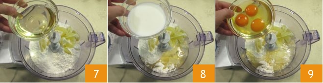 Ajoutez aussi l'huile de graines 7, le lait entier 8 et les œufs entiers 9,