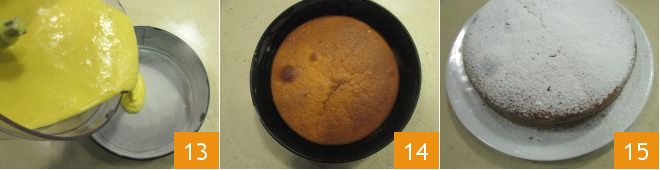 Versez la pâte à l'intérieur 13 et faites cuire dans le four statique préchauffé à 180° pendant environ 60 minutes, en la plaçant sur la grille basse. Une fois cuit (faites toujours le test du cure-dents en fin de cuisson), sortez le gâteau du four et laissez-le tiédir dans le moule 14, puis démoulez-le et saupoudrez-le de sucre glace. Votre délicieux pain de citron est prêt à être dégusté 15 !