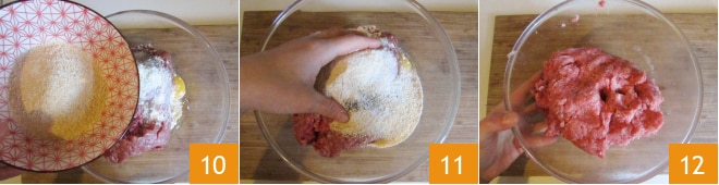 la chapelure 10, du sel, du poivre et commencez à pétrir 11. Travaillez pendant quelques minutes jusqu'à obtenir un mélange homogène 12.