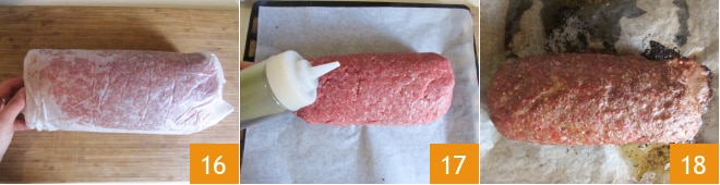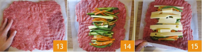 jusqu'à obtenir la forme classique du pain de viande. Laissez reposer au réfrigérateur pendant 30 minutes 16. Après ce temps, retirez le papier sulfurisé et placez le pain de viande farci sur une plaque recouverte de papier sulfurisé, huilez la surface 17 et passez à la cuisson : le pain de viande farci cuit dans un four statique, préchauffé en mode statique à 180°, pendant environ 50 minutes. Voici prêt votre pain de viande aux légumes et fromage, dégustez-le encore chaud 28