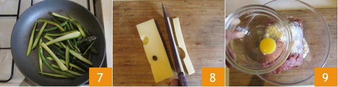 À la fin de la cuisson, ils seront croquants ; mettez à part les carottes ainsi que les asperges, les haricots verts et les courgettes pour qu'ils refroidissent 7. Coupez le fromage en tranches 8 et pétrissez le pain de viande. Dans un bol, versez la viande hachée et ajoutez le Grana Padano DOP râpé, l'œuf 9,