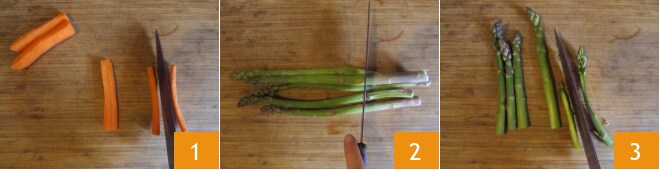 Pour préparer le pain de viande aux légumes et fromage, nous commençons par la farce. Après avoir épluché et coupé les carottes en bâtonnets d'environ 7-8 mm 1. Ensuite, coupez la partie la plus dure des asperges 2 et divisez-les en deux 3.