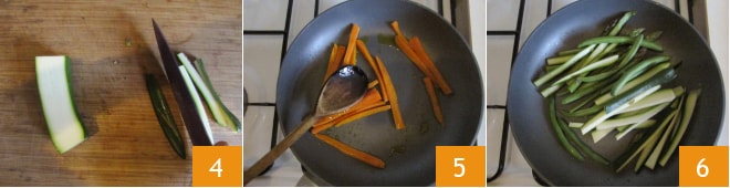 Enfin, épluchez les courgettes et coupez-les également en bâtonnets, ils devraient tous avoir à peu près la même taille 4. À ce stade, passez à la cuisson. Dans une poêle, versez un filet d'huile et laissez cuire à feu moyen pendant environ 5 minutes 5. Dans une autre poêle, faites cuire ensemble les asperges, les courgettes et les haricots verts, déjà épluchés, toujours avec un filet d'huile, pendant 5 minutes 6.