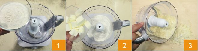 Pour réaliser le pain de viande en croûte, commencez par préparer la Pâte brisée. Placez dans le mixeur la farine 1, le beurre en morceaux froids du frigo 2, une pincée de sel et mixez le tout jusqu'à obtenir une texture sableuse et farineuse. À ce stade, disposez le mélange obtenu sur un plan de travail 3.