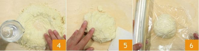 sous forme de fontaine classique et pétrissez le tout rapidement en ajoutant peu à peu de l'eau froide 4 jusqu'à obtenir une pâte compacte, ferme et assez élastique. Une fois prête 5, enveloppez votre pâte brisée dans un film alimentaire 6 et laissez-la reposer au réfrigérateur pendant au moins 40 minutes.